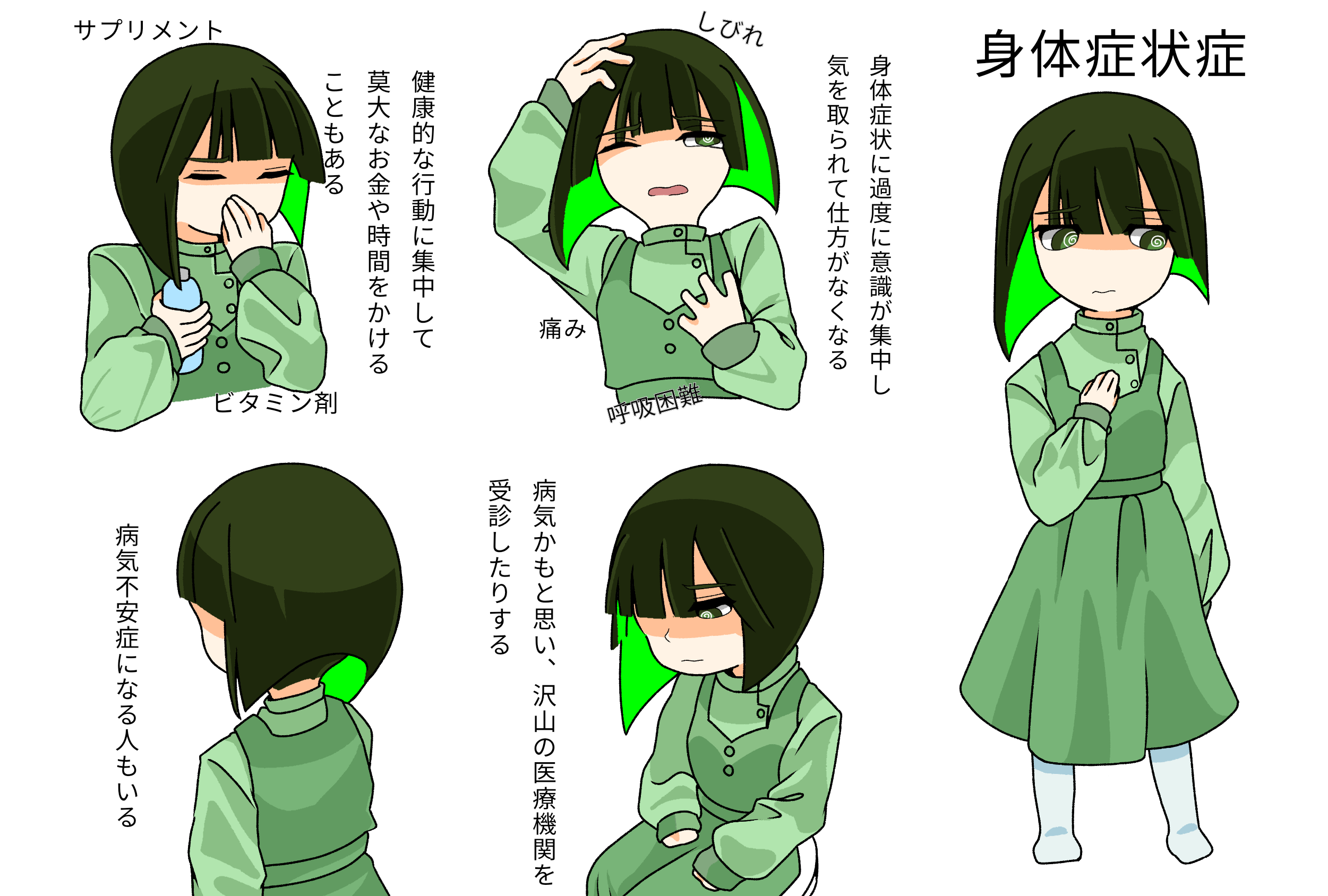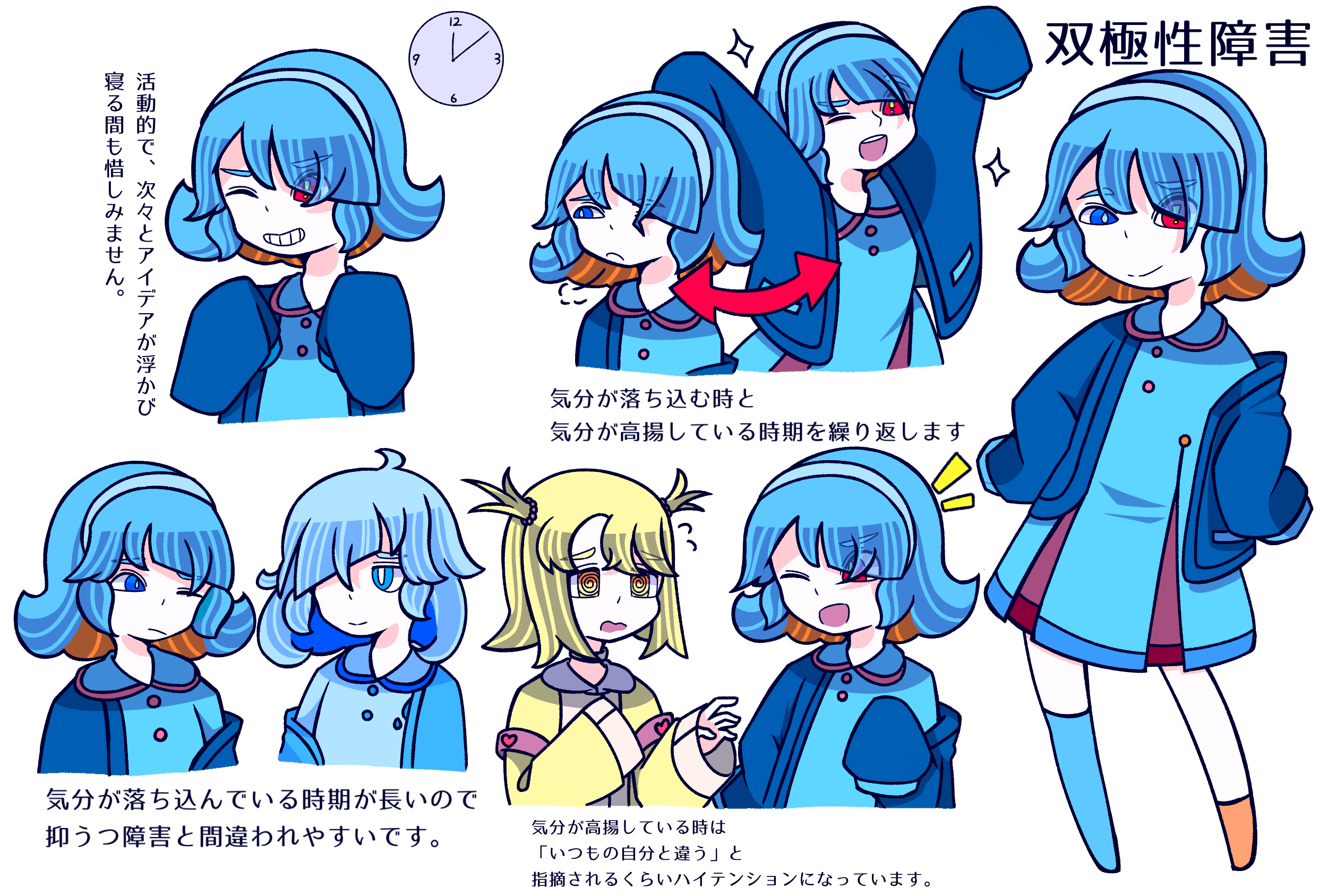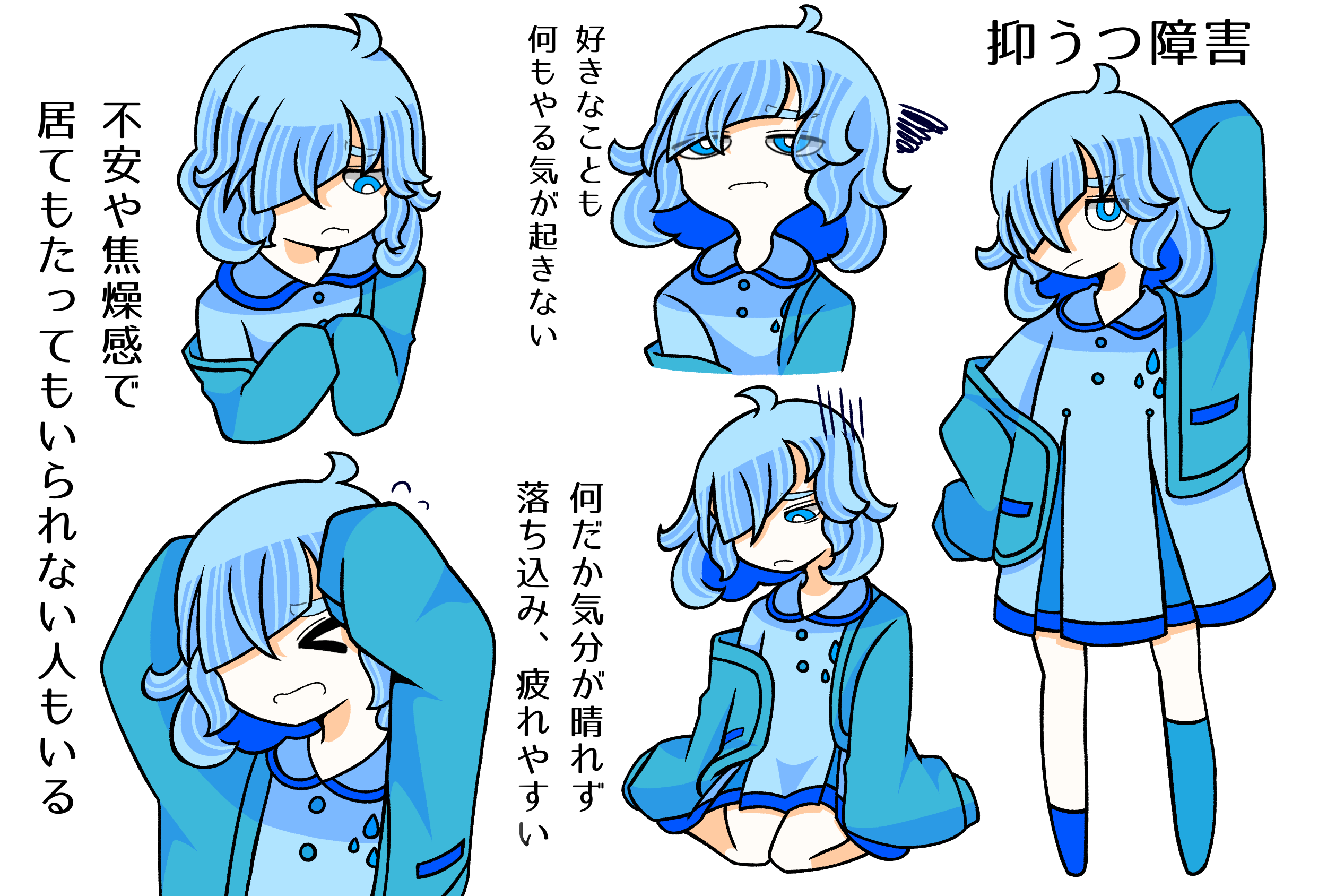 当院ホームページのイメージ画像を作成して下さった、『Aokuzira』先生に作成していただきました。精神疾患の説明イラストです。 クリックすると拡大画像を見れます。